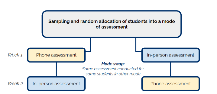 In the first week, half of the students were tested over the phone and the other half were tested in-person. As an important design consideration, we ensured that the sample of children assessed on phone were also assessed in-person within a week and vice-versa. This design helped us in making an apples to apples comparison between the two modes of assessment. Repeating the same test in different order of modes ensured that any effect of familiarity of the test in the first week cancels out in the second week for both modes.