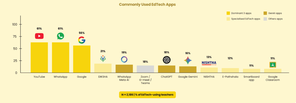 Teachers use EdTech in a more structured manner and their use spans a wider range of apps and tasks. Along with YouTube, WhatsApp and Google Search (84% use at least one), 45% also use specialised platforms such as DIKSHA (21%), Nishtha (13%) and E-pathshala (12%). Teachers use EdTech for lesson planning and delivery (63%), communication (77%) and administrative work (29%).