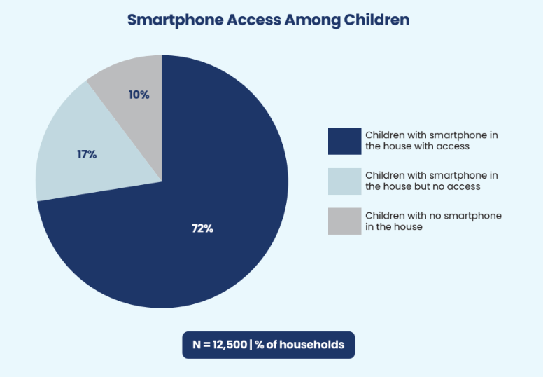 Bharat is going digital. 90% of households own one or more smartphones, and 72% of children are accessing the smartphone in the household. Majority of this access is shared, with a higher likelihood of sharing with the mother as compared to the father. Nearly all (99%) children report having internet access while using the smartphone and 84% of them spend more than 30 minutes on the smartphone, in a typical day.