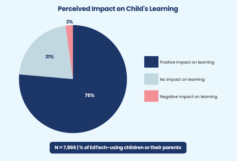 Majority of the children and parents feel that EdTech boosts learning (75%) and helps parents better support their child’s learning (95%). Teachers express even stronger confidence in improved learning outcomes (81%) and 96% feel that using EdTech helps them save time.