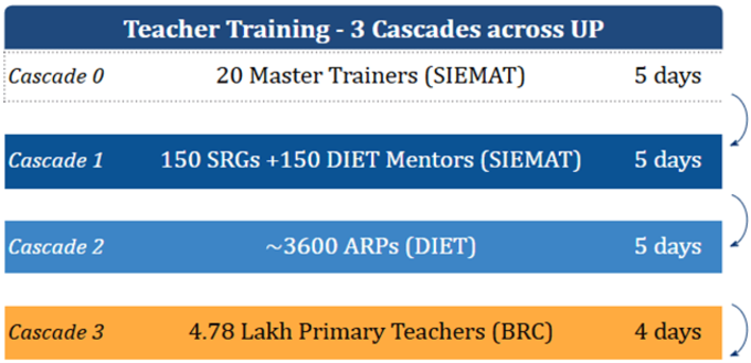 In the academic year 2023-24, teacher training in UP faced challenges that highlighted opportunities for improvement and innovation. Budget-related delays pushed the training schedule from August 2023 to January 2024, impacting momentum and continuity. The three-tier cascade model revealed limitations in ensuring uniform training quality, as inconsistent delivery across levels diluted the intended impact. Additionally, the need for more engaging, activity-based content and dynamic themes emerged, with teachers expressing fatigue over repetitive materials. Monitoring mechanisms also required strengthening, as irregular reporting to State Institute of Educational Management and Training (SIEMAT), Uttar Pradesh and logistical challenges affected preparedness and visibility. These experiences underscored the need for a more agile and robust framework, focusing on timely implementation, consistent quality across cascades, innovative content design and enhanced monitoring systems to ensure effective and impactful teacher training delivery. These gaps underscored an urgent need for a more robust and effective teacher training framework.