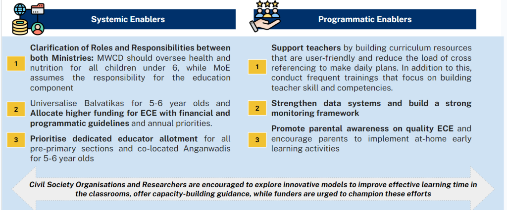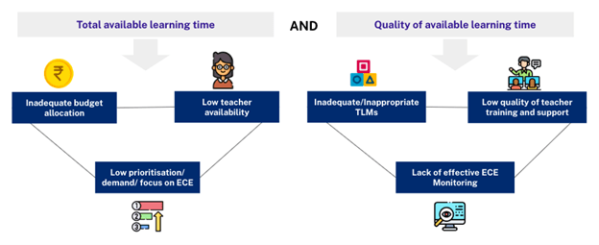 Systemic constraints to delivering quality ECE include low priority to ECE by both Ministries, significantly lower budgets for ECE in comparison to primary school years (~9x), and low availability of dedicated, qualified ECE teachers. There exists a need for research factors that may be strengthened to ensure quality ECE, such as teaching-learning time, teacher training, monitoring quality, parental perception of quality ECE and student learning outcomes.