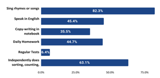 - Parents showed an active interest in their child’s learning but were unaware of how to best support them. Although there is an active interest in children’s learning, there is limited knowledge of what constitutes good ECE learning, school readiness, what to expect from an ECE teacher, and how to best support the child’s at-home learning. Parents defined quality early learning as their children’s ability to sing rhymes and speak in English.