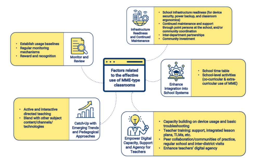 One of the biggest barriers to sustained smart classroom use is infrastructure upkeep. The study found that frequent power outages, lack of device security, broken devices and missing maintenance support led to 50% of smart classrooms becoming non-functional within two years of setup. Schools that collaborated with local government bodies and village councils to address power and security challenges saw higher adoption. Involving School Management Committees (SMCs) fostered ownership and improved maintenance.