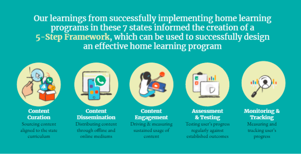 Recently, Central Square Foundation along with the Boston Consulting Group, Leadership for Equity, and Samagra launched the “Home Learning Playbook” in which we examined home-learning initiatives of seven Indian states and identified key learnings from them. The playbook proposes a five step framework which can be used to successfully implement home-learning programs across India (refer to figure 2).
