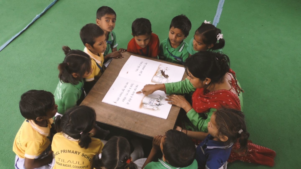 The teachers gradually and progressively help children develop an understanding of Hindi words, sentences, stories, poems and writing skills. These skills are built on the children’s own knowledge base and they help upgrade children to become confident readers and storytellers. The workbooks are well crafted and are used by the children not only to develop writing skills but have the potential to be colouring books or material for augmenting motor skills. There is compatibility between the prescribed class textbook Jhilmil and a comprehensive Teacher Guide, which reminds the teacher of the scope and variety of classroom transactions that she has been trained for and the way in which she must move forward. The block level supervisors and LLF support staff are regular visitors to the school and hold periodic reviews to reinforce her teaching methodology and to assess the learning outcomes of her class.
