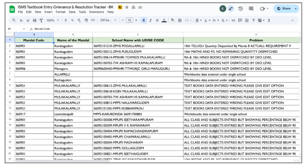 - In this process, the CSF team identified tech issues as a recurring challenge and created a troubleshooting Google Sheet, which was circulated for MIS coordinators to log and collate all technical issues, data entry errors and book shortages to be addressed in real time. The CSF team enabled the timely redressal of these issues in coordination with the DEO and state team.