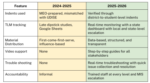 In 2024–25, the state rolled out the new end-to-end digital tracking system to streamline TLM delivery up to the school level. The system allowed data entry at every level (DEO, MEO, CHM, School HM) and generated automated reports for administrators.